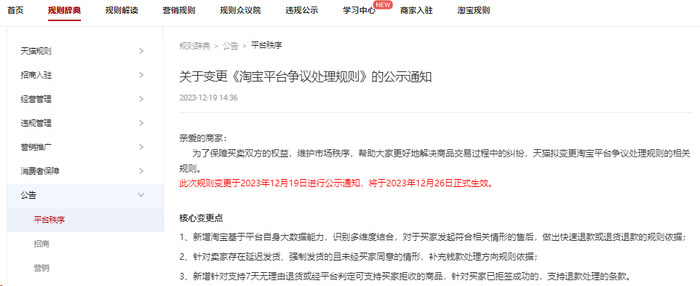 近期,淘宝对外发布了关于变更《淘宝平台争议处理规则》的公示通知,该通知于2023年12月26日正式生效,其中核心变更点第一条为“新增淘宝基于平台自身大数据能力,识别多维度结合,对于买家发起符合相关情形的售后,做出快速退款或退货退款的规则依据”。