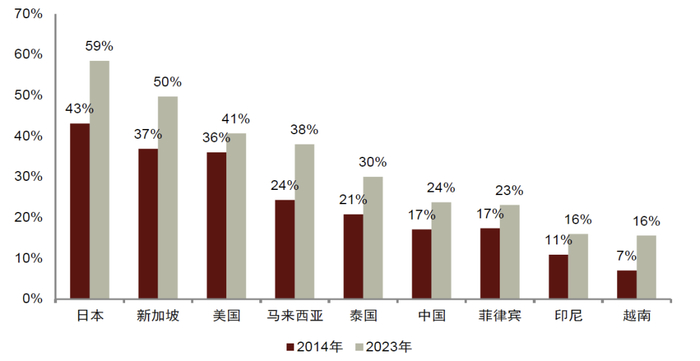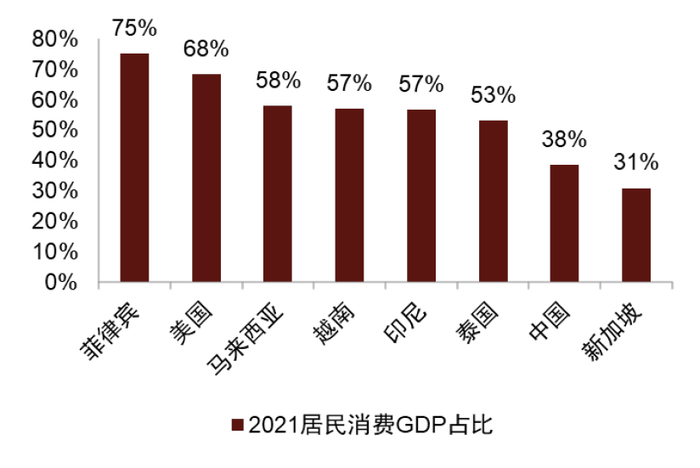 人口结构年轻化、消费意愿强:过去十年东南亚地区的人口平均增速超过中国的两倍,高出生率也预示中国过去的人口红利有望在东南亚复现。截至2022年末,东南亚地区30岁以下人口占比48.7%,显著高于中国的35.4%;且60岁以上的人口占比仅11.8%,较中国-6.2ppt。我们认为较高比例的年轻人口或带来更强的消费意愿,也更加拥抱新鲜事物、尝试不同的品牌。从2021年的GDP结构看,马来西亚、越南、印尼、泰国的居民消费均占GDP的53%~58%,人口中位数在23岁且受欧美文化影响较大的菲律宾居民消费贡献达GDP的75%,甚至高于美国的68%。