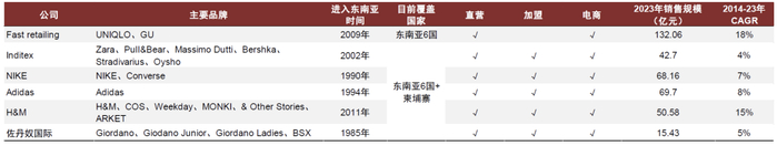 国际头部品牌目前东南亚销售规模在40~130亿元,且其市场保持快速增长,国内品牌出海空间可观。参考在东南亚市场排名靠前的国际品牌,目前基本都是直营、加盟、电商全渠道覆盖。从规模上看,Fast retailing一家独大2023年终端销售额超过130亿元,也是2014年以来增长最快的头部国际品牌,CAGR达18%,主要得益于门店的持续扩张。Adidas、Nike情况接近,销售规模均接近70亿元,CAGR 7~8%,其直营门店数量较少,多通过专业的运动加盟商和线上实现规模的扩张。快时尚品牌H&M、Inditex销售规模在40~50亿元,其中H&M因进入东南时间相对较晚,CAGR为15%的较快增长。目前国内品牌在东南亚规模尚小,随着各公司对渠道的加速拓展,以及东南亚市场自身的持续增长,我们预计将给国内公司的规模发展带来可观的增量。