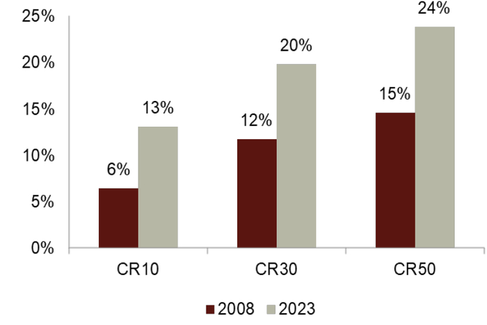 图表15:2014和2023年各国鞋服市场品牌CR50