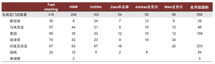 东南亚具有大量低线城市,中国品牌善于多层级市场布局。根据东京大学发布的《2022年度亚洲百强城市研究报告》,东南亚国家中仅上榜单9个城市,东南亚中大部分城市仍处于国内下沉市场发展阶段。因此其服装市场品牌化的提升,不仅需要品牌在重点城市开店,还需要布局广泛的下沉市场。回顾国内鞋服市场的品牌化进程,伴随着服装品牌跑马圈地式的门店拓展,深入布局国内各线城市,国内品牌对于不同层级市场的渠道发展及管理经验丰富。