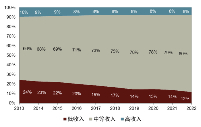 居民购买力提升潜力大:对比中国,我们把东南亚6国的人均可支配收入分为三档:1)经济水平较为发达的新加坡(34,895美元);2)与中国2018年(6,358美元)水平相当的马来西亚;3)处于中国2010年(3,559美元)前后水平的泰国、菲律宾、印尼和越南。而第三档涵盖了东南亚地区大部分人口和面积,我们认为随着经济的发展,未来居民的购买力或有较大的提升潜力。我们看到东南亚6国15岁以上的群体中,低收入群体占比从2013年的24%持续下降至2022年12%,中等收入群体持续扩容至80%。根据波士顿咨询预测,未来“大众富裕”阶层有望成为驱动东南亚消费市场扩容和升级的主要力量[1],到2030年东南亚的大众富裕阶层将由2017年的570万扩容至1.36亿,约占总人口的21%,将掌握其人数占比2~3倍的家庭财富,消费能力为其他人群的2~3倍。