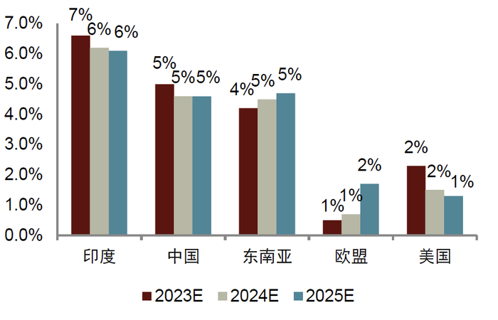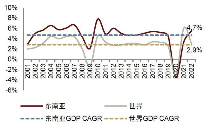 注:1)此处东南亚地区包括东南亚6国,即印尼、马来西亚、菲律宾、新加坡、泰国、越南;2)均采用实际GDP的同比增速