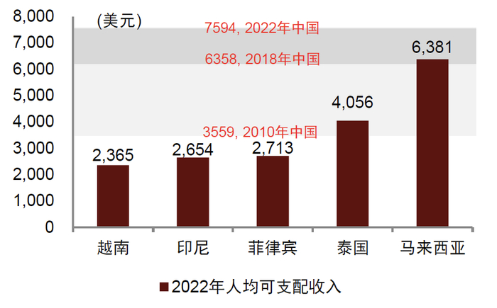 注:1)此处东南亚地区包括东南亚6国,包括印尼、马来西亚、菲律宾、新加坡、泰国、越南;2)世界银行将中等收入定义为日均收入位于$10-$100区间的群体。由于数据可得性限制,此处将其近似年收入$3,500-$40,000(PPP)群体