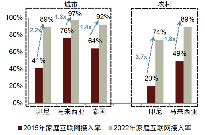 图表20:2015-22年部分国家城乡家庭互联网接入率