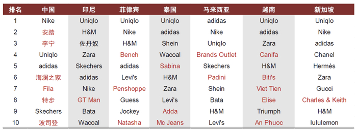 以国际品牌为主,东南亚本土头部鞋服品牌较少。根据Euronomitor数据,东南亚市占率靠前的鞋服品牌以国际的休闲、快时尚品牌和运动品牌为主。如Uniqlo为东南亚多个国家市占率第一的品牌,H&M、Zara、Levi’s也深受东南亚消费者欢迎,运动品牌中Nike、Adidas和Skechers市占率排名靠前。新加坡由于其经济高度发达,国际奢侈品牌的市场份额高。我们看到,除越南以外,东南亚的头部鞋服品牌中本土品牌较少,前十中仅约有2个,而中国市场前10中有6个品牌,说明东南亚消费者对海外品牌的接受度较高。国内跨境电商品牌Shein、线下服装品牌佐丹奴也已成功进入东南亚市场,成为部分国家的前十大品牌。