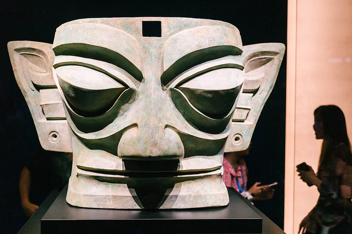 2023年8月2日,四川德阳,三星堆博物馆新馆开馆之际,展出的青铜大面具。它是目前已知三星堆遗址出土的体量最大、保存状况完好的大型青铜面具。其宽颐广额、棱角分明,眉部、眼睛、嘴唇等线条流畅、皆突出于面部,粗长眉作扬起状,面具的两侧上下及额部正中有方形穿孔,可能是用于固定用途。