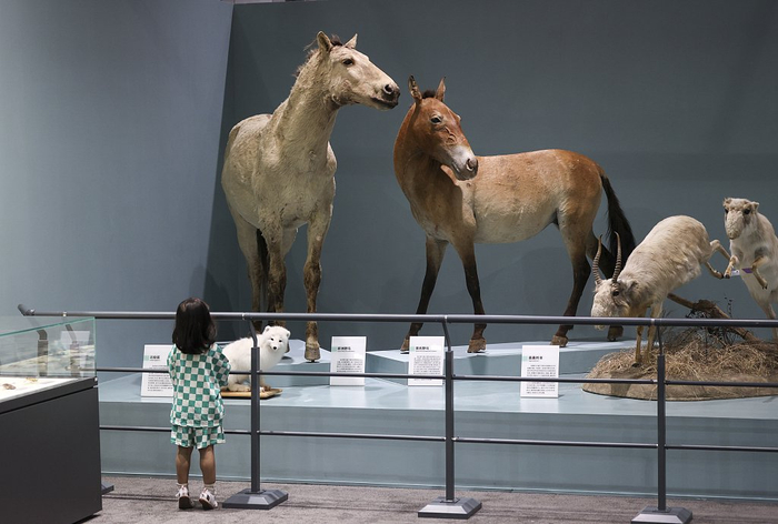 2023年6月6日,北京,“撷英集萃•继往开来——国家自然博物馆馆藏精品展”面向公众开放参观。这是国家自然博物馆挂牌后举办的首个展览,通过展示不同时期的馆藏精品,聚焦过去72年(1951年——2023年)发展过程中的收藏和研究成果,部分珍贵的文字和视频资料是首次与观众见面。一名小朋友参观欧洲野马、北极狐等动物的标本。
