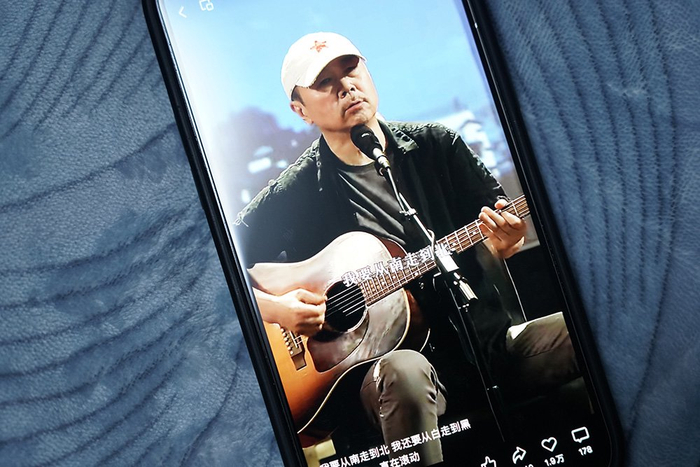 2023年12月26日,上海,手机上播放的崔健线上演唱会视频。12月22日,崔健「滚动的力量」雪山知交音乐会12月22日在微信视频号进行了直播。摄影:范剑磊