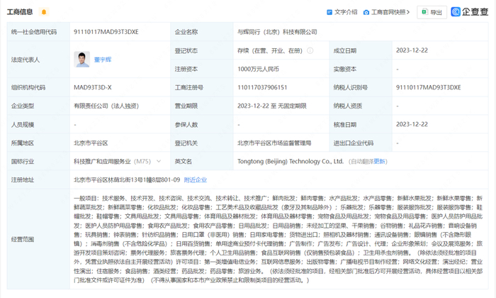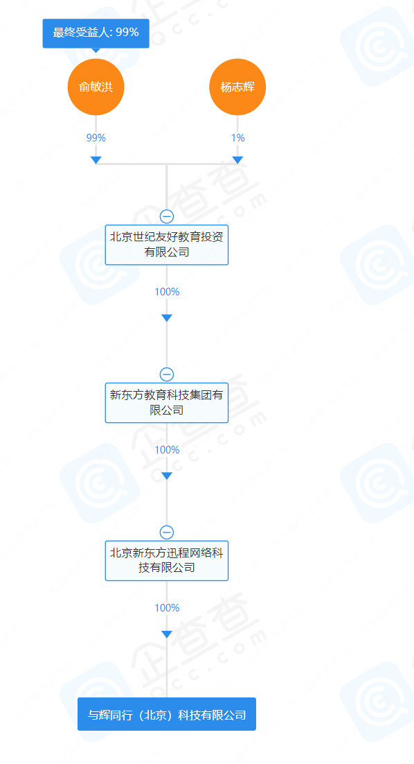 企查查显示,与辉同行(北京)科技有限公司于2023年12月22日成立,注册资本1000万元,法定代表人为董宇辉,俞敏洪担任监事,同时也是受益所有人,最终受益股份99%