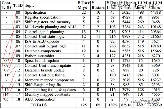 主题(Topics):每个线程一个主题对于处理器的早期设计阶段效果很好(有一个例外,其中 ALU 是在与多周期处理器时钟周期时序计划相同的线程中设计的)。然而,一旦处理器进入模拟阶段并在其上运行程序,我们就发现了规范和实现中的错误和错误。设计工程师没有开始新的对话线程并重建先前的上下文,而是选择在适当的情况下继续先前的对话线程。我们在下面的流程图中对此进行了说明,其中“Cont. T. ID”列指示他们是否“Continued”前一个线程(如果是,则为哪个线程)。