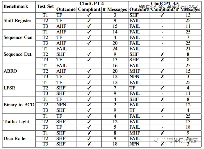 ChatGPT-3.5的表现明显比 ChatGPT-4 差,大多数对话都导致基准测试失败,并且大多数通过自己测试平台的对话都是不合规的。ChatGPT-3.5 的故障模式与 ChatGPT-4 相比不太一致,每次对话和基准测试之间都会引入各种各样的问题。与 ChatGPT-4 相比,它需要更频繁地修正设计和测试平台。