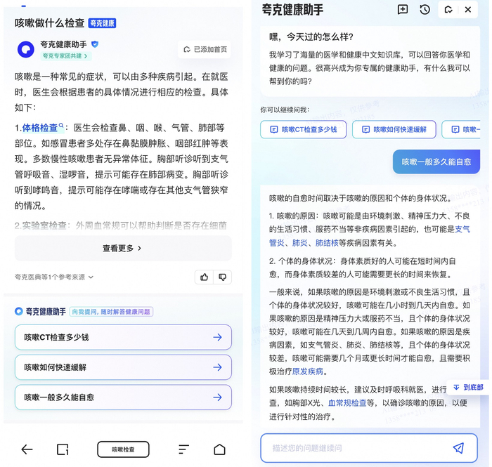 据悉,在产品层面,夸克推出大模型健康应用“夸克健康助手”,融合医学知识图谱和生成式对话能力,用户可以在部分搜索结果中,看到由夸克健康助手回答的AIGC内容。与传统搜索结果相比,提供了更加全面和准确的健康信息。