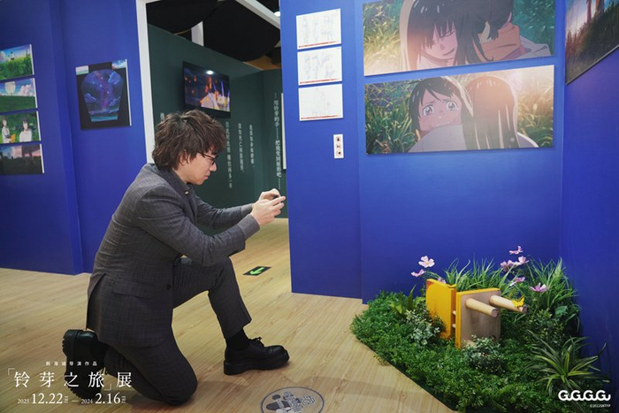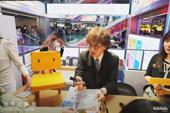 日前在上海无限极荟购物中心开幕的《铃芽之旅》展,是GuGuGuGu成立后举办的首个重磅活动,展期将延续至明年2月16日。该展览将影片中最具代表性的道具,比如三条腿的黄色椅子、能通向神灵世界的“往门”带到现场,大量的原画手稿和分镜头脚本向粉丝展示影片背后的创作细节,同时设有打卡区域,让粉丝与影片中的代表性的场景互动。此外还有《铃芽之旅》定制款咖啡以及衍生品周边售卖。12月21日,正式开展前一天,新海诚来到展览现场与粉丝近距离对谈,活动从白天一直持续到夜晚。