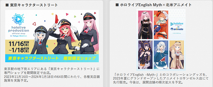 11月开始,在东京车站地下街“东京Character Street”开设hololive期间限定店,除了销售官方店的部分商品外,还特别制作了担任“东京观光大使”的3名VTuber的新原创商品。