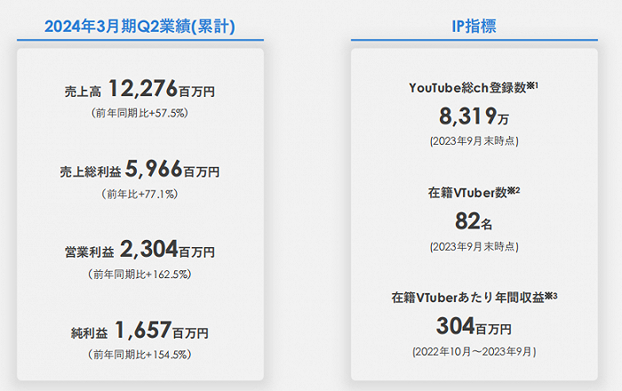 hololive/cover最新发布的2024年3月期2季度累计(2023.4.1-2023.9.30)财报显示,这半年它的销售额122.76亿日元(同比增长57.5),营业利润59.66亿日元(同比增长77.1%),当期纯利润16.57亿日元(同比增长154.5%)。今年来保持着良好增长态势。