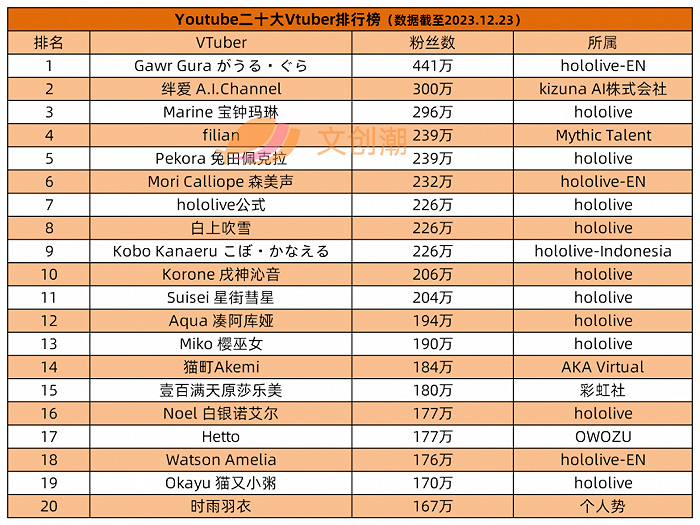与去年的TOP20相比,2023年的榜单人员并未出现较大变化。回顾文创潮去年的文章:从主播到IP,VTuber在2022高速增长