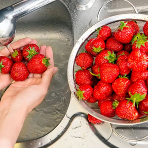清洗草莓时不要摘掉草莓蒂用清水冲洗过后,再用清水、淘米水、淡盐水、小苏打浸泡 5 分钟后再冲干净。