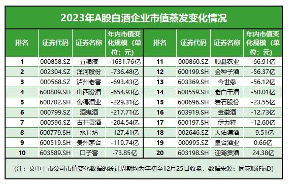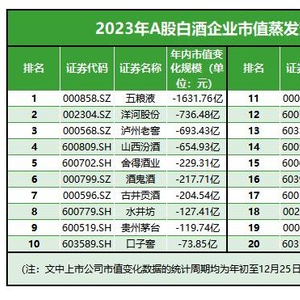 2023十大市值失意酒企:五粮液最“惨”,洋河泸州老窖汾酒靠前