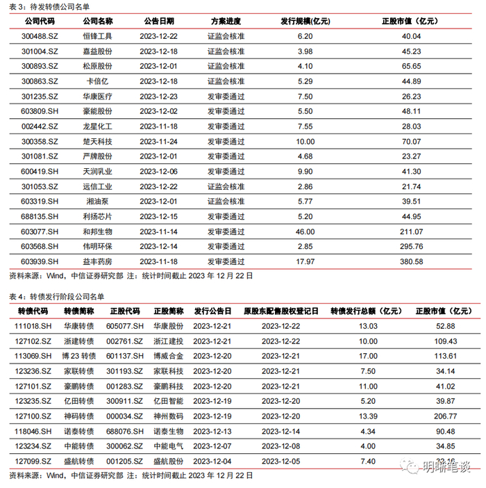 投资策略:(1)转债发行阶段可以博取抢权策略带来的正股收益,建议提前关注转债已通过发审委或证监会核准还未发行的上市公司。截止2023年12月22日,建议关注恒锋工具、嘉益股份、松原股份、卡倍亿、华康医疗、豪能股份、龙星化工、楚天科技、严牌股份、天润乳业、远信工业、湘油泵、利扬芯片、和邦生物、伟明环保、益丰药房。(2)警惕已公布转债发行公告的公司正股股价在原股东股权配售日之后下跌的风险。截止2023年12月22日,建议关注华康股份、浙江建投、博威合金、家联科技、豪鹏科技、亿田智能、神州数码、诺泰生物、中能电气、盛航股份的下跌风险。