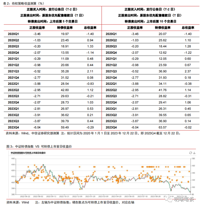 抢权策略至今仍然具有赚钱效应。我们采用2020年1月1日至2023年12月22日数据进行测算,发现抢权策略至今仍然具有赚钱效应。抢权策略的收益可以分为正股收益和转债收益,我们的测算,抢权策略中正股收益部分几乎为负,但是转债收益为正且较高,足以弥补正股的负收益。次新转债没有强赎条款与大股东减持干扰,在权益市场整体行情偏下行震荡阶段受到投资者关注度更高,往往会有较高的定价。在大样本的维度下,抢权策略是一个盈利的策略,因此预计还会有源源不断的资金持续参与,对正股的短期压制仍然存在。