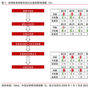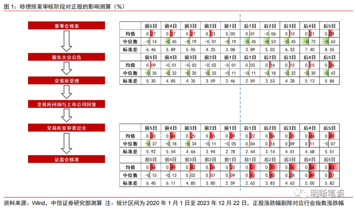 转债预案审核阶段对正股价格没有显著影响。全面注册制后,主板上市公司发行转债的审核流程与创业板和科创板一致。审核流程的关键时间点有:(1)董事会预案;(2)股东大会公告;(3)交易所受理;(4)交易所问询与上市公司回复;(5)交易所上市审核委员会审议通过;(6)证监会核准同意注册。我们采用2020年1月1日至2023年12月22日的数据,对发行人在每一个时间节点前后股价波动进行了测算。上述时间节点前后正股价格并没有显著变化。可转债在预案审核阶段并不会实质性转股,转股价的设定方式往往为“不低于募集说明书公告日前二十个交易日公司A股股票交易均价和前一个交易日公司A股股票交易均价”,相较于定增而言不存在“折价”发行的问题。投资者可能更加关注转债募资项目本身对公司发展的战略意义。