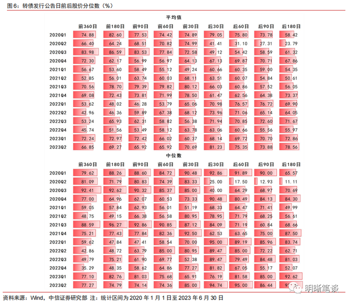 从转债发行时间节点来看,上市公司往往在股价较高分位数发行转债。《上市公司证券发行注册管理办法》第六十四条规定“向不特定对象发行可转债的转股价格应当不低于募集说明书公告日前二十个交易日上市公司股票交易均价和前一个交易日均价”。我们根据Wind统计了(本段下同)2020年1月1日至2023年6月30日的历史数据,大部分上市公司发行转债的时间阶段股价处于过去一年大约70%的分位数水平,即发在了股价比较高的位置,这样有利于降低转股稀释率。当然,发行时间阶段的股价也跟市场环境有关,在市场底部和行业底部,如2022年上半年上市公司发行转债会发在股价较低的位置,大约位于过去半年股价40%的分位数水平。