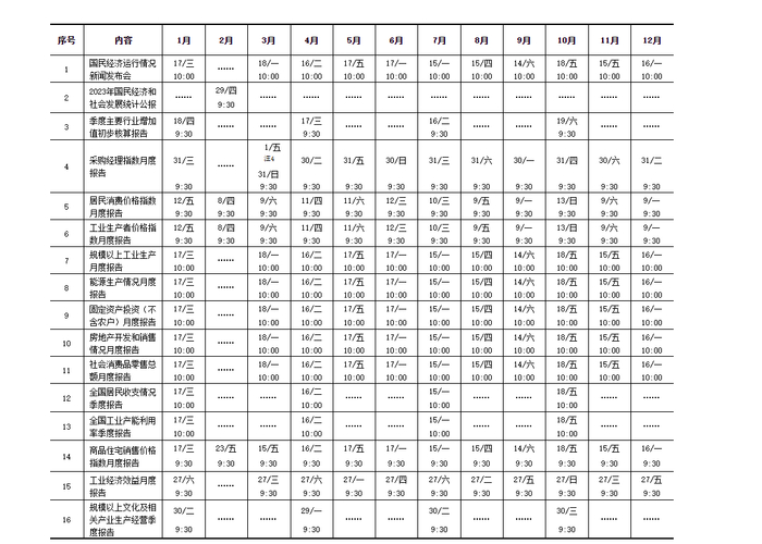 2.1月、4月、7月、10月分别召开年度、季度国民经济运行情况新闻发布会,3月、5月、6月、8月、9月、11月和12月召开月度国民经济运行情况新闻发布会。在发布国民经济运行情况新闻发布稿的同时,分别发布工业生产、能源生产、固定资产投资、房地产开发投资和销售、社会消费品零售总额等月度或累计数据情况新闻稿。