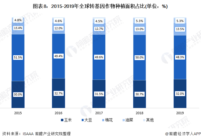 全球四大转基因种植品种包括大豆、玉米、棉花、油菜,2019年,四大品种种植面积占全球转基因总种植面积99.1%,占比从高到低依次为大豆48.3%、玉米32.0%、棉花13.5%、油菜5.3%。