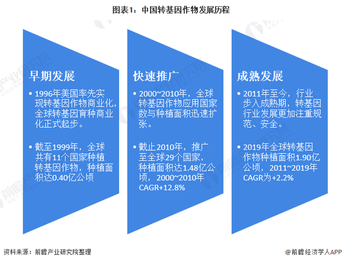 转基因作物的商业化种植始于1996年,从历史发展看,转基因育种发展期间经历了早期探索、快速推广、成熟发展三个阶段。