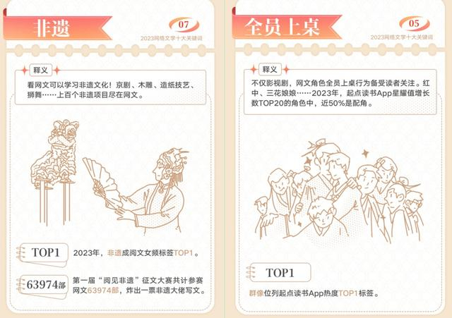 与此同时,2023年,网络文学在高质量传承传统文化脉络方面继续发力。京剧、木雕、造纸技艺、狮舞……上百个非遗项目尽在网文,掀起新一轮传统文化热。“非遗”跃升为女频标签TOP1,第一届“阅见非遗”征文大赛共参赛网文63974部,看网文成为学习非遗文化新路径。