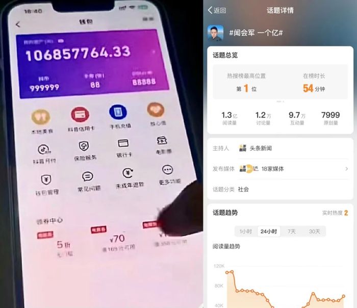 互联网上出现了疑似“闻神”账号的后台,显示该账号余额超1亿元。“闻会军 一个亿”相关话题冲上热搜榜一。(图/微博)
