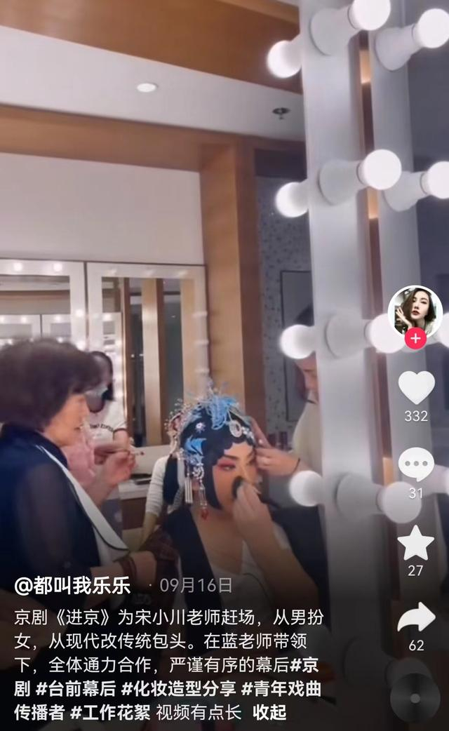 《进京》化妆师为宋小川拍了3分钟改妆视频,如何从上半场光头小生变为下半场男旦。“上半场岳九展现刚毅,下半场侧重柔美,骨子里有积极向上的力量。”宋小川说,“我是男人,岁数大,再秀气,头还是比女演员大。设计师一开始为我设计金光闪闪的头冠,灯光一照,显得我脑袋更大。我说,不行不行,还是朴素些好。”