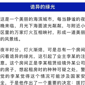 这是某市国家安全机关接到的群众举报电话内容,“打电话的是谁?”“发着绿光的又是什么?”