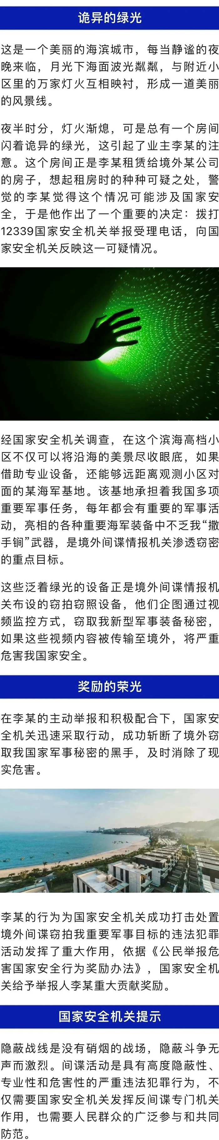 国家安全部微信公众号12月27日公布了一起外国人租高档小区民房偷拍我海军基地的间谍案,房东因举报诡异绿光,获重大奖励。