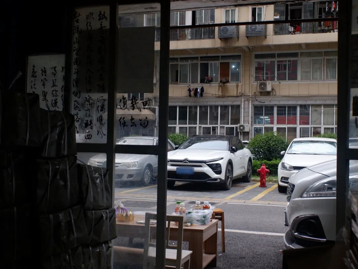 这里常年不见太阳,弥漫着旧书和灰尘的味道。它原本是武汉华中科技大学附近小区一楼的一间车库,隐藏在居民楼的打印店、快递驿站中间,停在门口的车辆常常挡住它的一半店面。改装成书店后,它的采光完全依赖于头顶的那两只还能正常工作的白炽灯,但陈飞给这里取名为“太阳书库”。