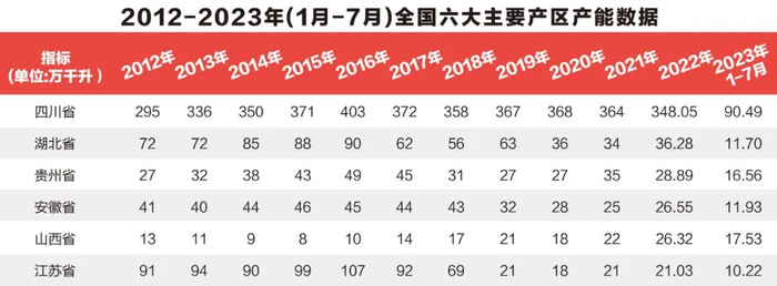 2023年,产区价值进一步上升。据报告中数据显示,2023年1-7月,四川、湖北、贵州、安徽、山西、江苏六大产区总产能达158.43万千升。其中,四川省90.49万千升;湖北省11.7万千升;贵州省16.56万千升;安徽省11.93万千升;山西省17.53万千升;江苏省10.22万千升。