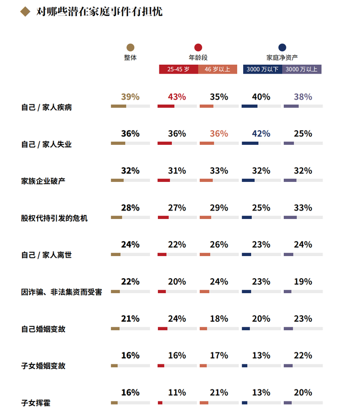 关于引发现金流危机的家庭内部危险事件,高净值人群最为担忧的是自己或家人的健康。分人群看,46岁以上的高净值人群, 伴随子女的逐渐成熟、 脱离控制,比45岁以下人群更为担心子女挥霍。3000万家庭净资产以上人群则比较担忧子女婚姻变故。3000万家庭净资产以下人群由于可投资资产还不足够充裕,更为倚仗劳动性收入,因而对自己/家人失业较为担忧。