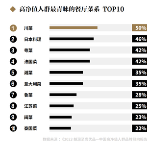 从饮食偏好来看,高净值人群更偏好川菜和日料。本土菜系中,南方菜系最受欢迎,包含川菜,粤菜、湘菜和闽菜,其中川菜以50%的受选率问鼎冠军;北方菜系仅有鲁菜上榜。国外菜系中,日料以 46% 的受选率位列首位,其他著名的菜系如法国菜、意大利菜都进入了前十。