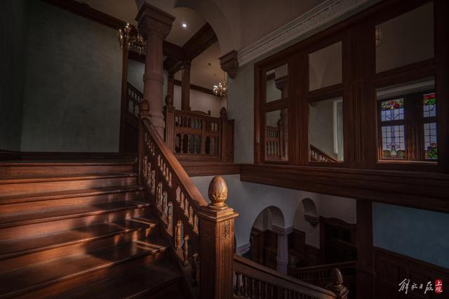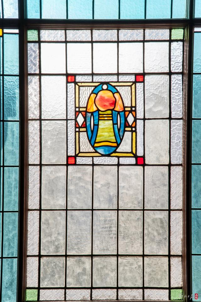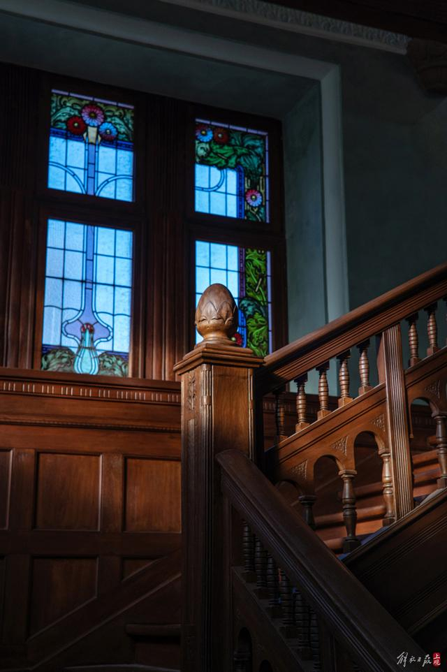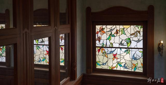 上下楼过道墙面的彩绘玻璃窗经过精细修复,保留部分原来的玻璃,又根据图纸修旧如故,定制同样纹饰的新玻璃相匹配。