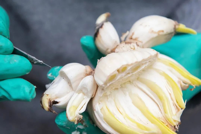 定位开盖后,需要把夹在芽体之间的鳞片一一去除,使各芽体之间有空隙,便于后期对芽苞片、叶片和花梗进行加工雕刻。雕刻时,可使用刻刀的U形刀头伸进各花芽缝间,要小心避免伤到花芽哦。