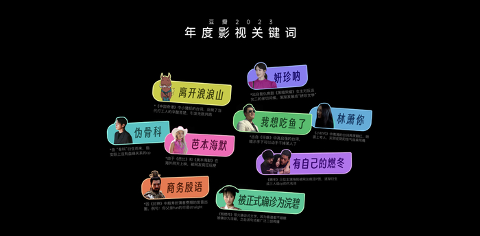 同时,榜单还发布了“年度影视关键词”,大热剧集《狂飙》中高启强的台词“我想吃鱼了”,因《封神》中殷寿扮演者费翔的发音出圈的“商务殷语”,包揽了“2023评分最高韩剧”前两名的《黑暗荣耀》里的台词“妍珍呐”,以及被《甄嬛传》带火的确诊式文学“被正式确诊为浣碧”等,都纷纷上榜。