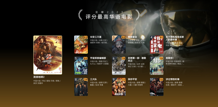 据豆瓣电影相关负责人介绍,该榜单基于豆瓣用户的影视条目标记数据,通过算法综合了评分、评分人数和时间等因素得出。今年的榜单主题为“光点与余晖”,概念来自上榜评分最高华语电影的《流浪地球2》和《宇宙探索编辑部》。在《流浪地球2》“暗淡蓝点”版海报中,使用了旅行者1号探测器拍摄的著名照片——从40亿英里外的太空往回看,地球只是太阳光束上的一个小点,“这个小小的白点是我们的一切”;落魄的中年男人唐志军,指着老式电视机上的雪花点,对着银幕外的人郑重地说:“这不是普通的雪花点,这是宇宙诞生时的余晖。”《宇宙探索编辑部》的这一幕成为2023最打动人心的电影画面之一。宇宙浩渺无边,却与每一个人的命运休戚相关。电影银幕上,一个个独立的光点组成了光影的宇宙,记录一切,亦回应宇宙诞生时的壮阔;这些伟大的光点,与宇宙的余晖一同永恒。