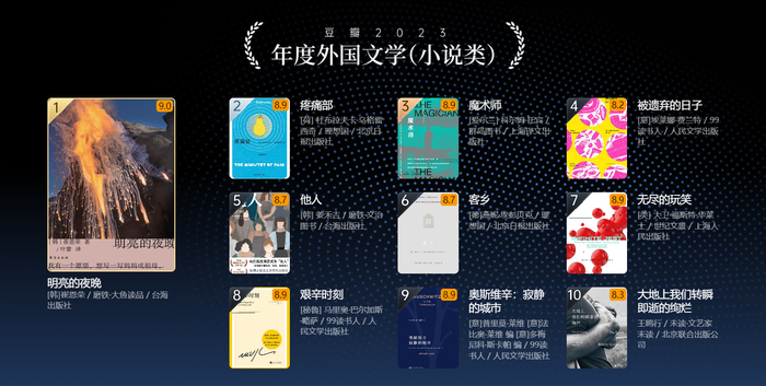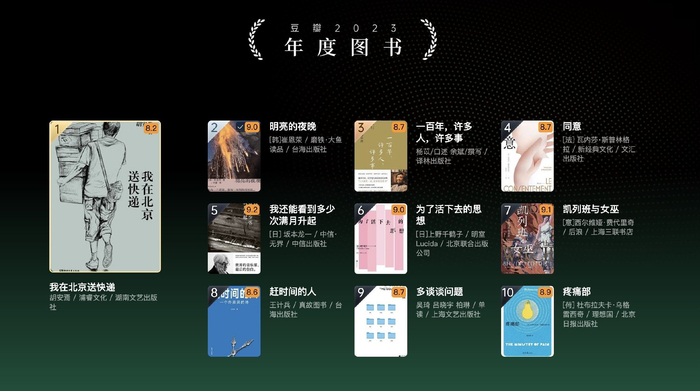 从豆瓣2023年度读书榜单看,首榜“年度图书”前三分别为胡安焉《我在北京送快递》、崔恩荣《明亮的夜晚》、杨苡《一百年,许多人,许多事》。马伯庸的《太白金星有点烦》则位列“年度中国文学(小说类)”第一,崔恩荣《明亮的夜晚》为“年度外国文学(小说类)”第一。上野千鹤子、残雪、莫言、杨本芬、胡安焉、马伯庸等10位作者为“2023年度作者”。