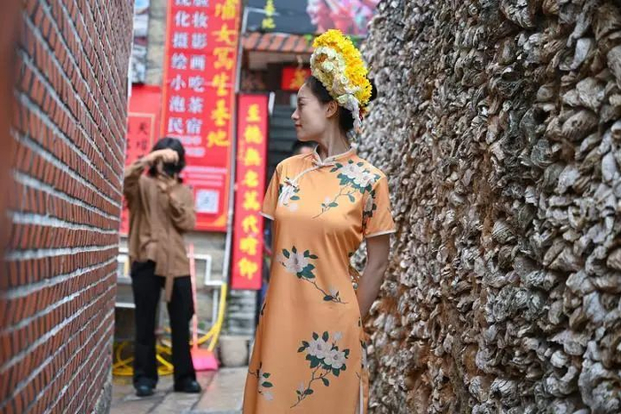 慕名而来的游客戴上簪花,穿上特色服饰,站立在蚵壳厝旁,只为体验当一天“蟳埔姑娘”。据统计,蟳埔村节假日日均游客量一度达到5万人次。