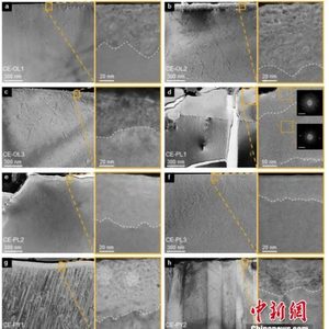 记者2022年9月12日从中国科学院地球化学研究所获悉,通过对嫦娥五号月壤样品研究,发现嫦娥五号矿物表层中存在高含量的水,来源于太阳风的注入作用,其主要以OH的形式存在。嫦娥五号矿物表层显微结构的TEM图。中国科学院地球化学研究所供图