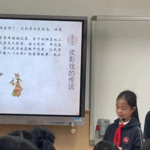 这是一节介绍皮影戏的课程。3位五年级学生分工合作,有人负责讲解皮影戏的起源、有人负责介绍皮影戏的制作、有人负责介绍皮影戏的传承发展。