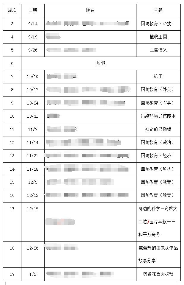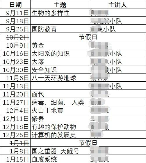 而每个学期自主课堂的准备,从假期里就开始进行了。低年级主要由老师来协调,高年级则在班级设立课代表,由课代表来制定主题、安排计划、召集同学。排片表生成之后,每位同学就知道自己在开学之后的任务了。