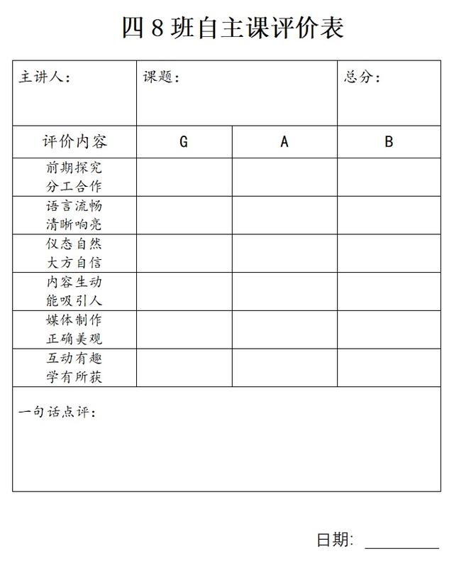 课上得好不好,学生也会互相评价,评价的内容包括前期准备、现场表达、仪态、内容、课件、收获等不同维度,分不同的级别,各班的表格细节或有不同。