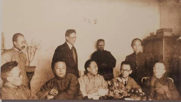 1927年1月摄于周作人家。前排左起:沈士远、刘半农、马裕藻、徐耀辰、钱玄同。后排左起:周作人、沈尹默、沈兼士、苏民生。